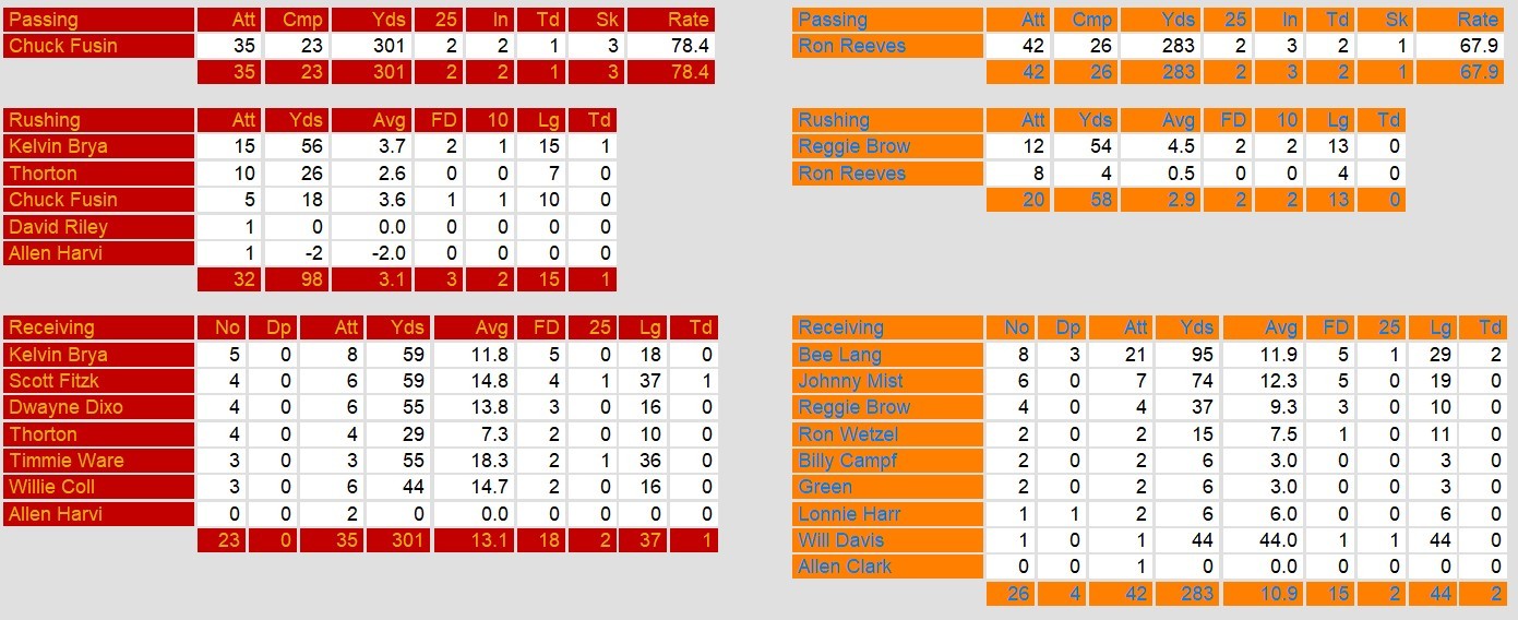 Arizona quarterback Ron Reeves found his rhythm after the break, connecting with wide receiver Bee Lang for two third-quarter touchdowns. Lang showcased his playmaking ability, finishing with 95 yards on eight catches and earning game MVP honors. The Wranglers’ defense provided the final blow when Lance Shields scooped up a Chuck Fusina fumble and returned it 59 yards for a touchdown in the fourth quarter, sealing the victory.