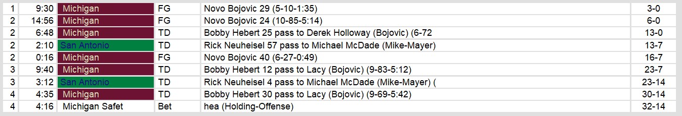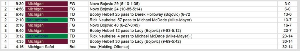 Michigan controlled the game from the outset, scoring on five of their first six possessions. Novo Bojovic’s accurate kicking provided the Panthers with a steady cushion, converting all three field goal attempts, including a 40-yarder just before halftime. Hebert’s connection with Derek Holloway for a 25-yard score and a pair of touchdown passes to Lacy in the second half helped extend the lead. Although Neuheisel found Michael McDade twice for touchdowns, San Antonio’s offensive line struggled to protect him, with Bethea and Kyle Borland combining for three sacks.