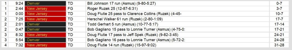 Denver started strong, with Bill Johnson’s 17-yard touchdown run capping an opening drive to put the Gold ahead. However, New Jersey responded quickly, with Flutie’s 25-yard touchdown strike to Clarence Collins giving the Generals their first lead at the end of the first quarter. Walker’s electrifying run extended the lead to 17-7, but the Gold countered with consecutive scores, including Bob Gagliano’s 15-yard touchdown pass to Lonnie Turner, to take a 21-17 halftime lead. Both teams traded scores in the third quarter before Flutie orchestrated a 15-play, 97-yard drive in the fourth to seal the victory.