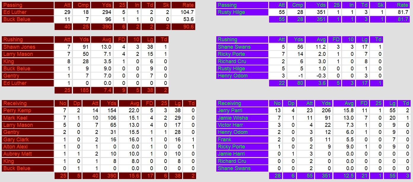 New Orleans quarterback Rusty Hilger delivered one of his best performances of the season, throwing for 351 yards and three touchdowns. His favorite target, Jerry Parrish, was sensational, hauling in 13 receptions for 206 yards and two scores, including a 55-yard bomb that ignited the Brass’ offense in the first quarter. Running back Shane Swanson also contributed with 56 yards on the ground and a touchdown. However, critical missed opportunities, including a failed field goal and a turnover on downs in the game’s final minutes, dashed New Orleans’ upset hopes.