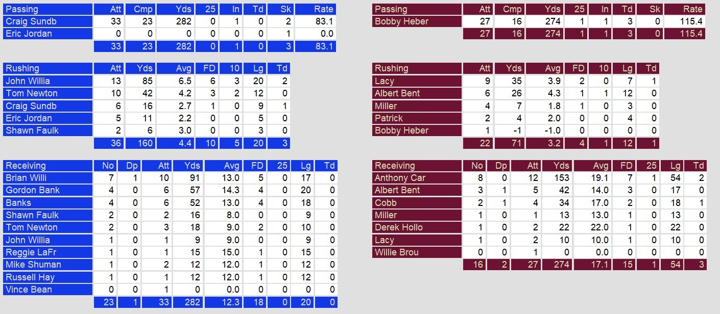The game featured standout performances from both teams. Michigan quarterback Bobby Hebert shone in the first half, connecting with Anthony Carter and Cobb for touchdowns, giving the Panthers a 14-6 halftime lead. Carter was electric throughout, finishing with 153 yards and two scores, including a 54-yard bomb in the fourth quarter that temporarily tied the game at 28. However, the Oakland defense stepped up when it mattered most, with Lynn Thomas securing a crucial interception in the game’s final moments to deny Michigan a last-minute comeback attempt.