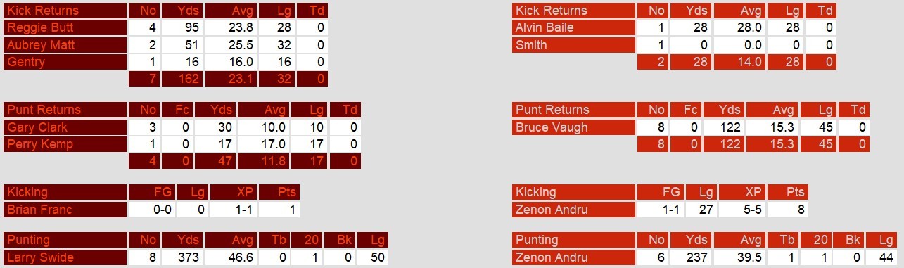 Jacksonville struggled to find their footing, managing just 196 total yards. Backup quarterback Buck Belue connected with Aubrey Matthews for an 18-yard touchdown late in the fourth quarter to avoid the shutout. Despite their struggles, running back Larry Mason provided a bright spot for the Bulls, rushing for 58 yards on just eight carries. Meanwhile, Bruce Vaughan’s standout punt return performance, including a 45-yard return, earned him game MVP honors, reflecting the Bandits’ superiority in all phases of the game.