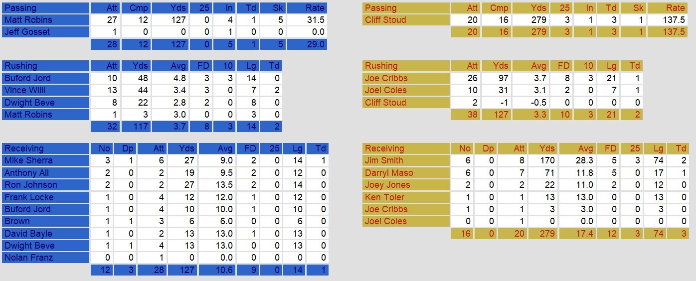 The second half saw the Stallions shift into high gear, led by quarterback Cliff Stoudt, who threw for 279 yards and three touchdowns. Stoudt connected with Jim Smith on a 25-yard strike midway through the third quarter to bring Birmingham within one, and Joe Cribbs’ 1-yard touchdown run shortly after gave the Stallions their first lead of the game. Boston briefly reclaimed the advantage in the fourth quarter on a 1-yard plunge by Williams, his second rushing score of the game, but the Stallions answered decisively. Stoudt found Smith again, this time for a 20-yard touchdown, and followed it up with an 8-yard pass to Darryl Mason to seal the win with under a minute remaining.
