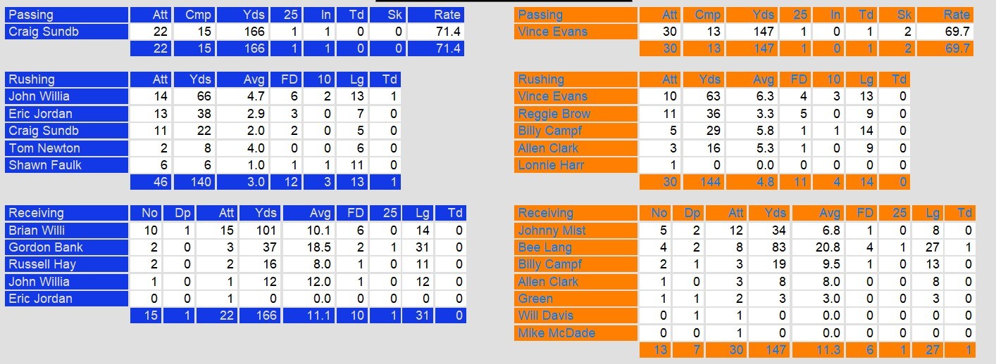 Oakland countered Arizona’s early score with a balanced attack led by running back John Williams, who rushed for 66 yards and a touchdown. The Invaders held a 13-10 halftime lead, thanks to Williams’ 7-yard scoring run and a pair of field goals from Jess Atkinson. Defensively, Oakland’s Tim Moore made a crucial play in the third quarter, forcing a safety that briefly gave his team a two-point lead. However, the Invaders struggled to finish drives late, highlighted by a costly fourth-quarter fumble that denied them a chance at a game-winning score.