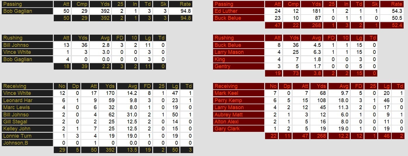 In a game filled with rain-soaked drama at the Gator Bowl, the Denver Gold stunned the Jacksonville Bulls, 27-24, thanks to a masterful performance by quarterback Bob Gagliano. Gagliano, who was named MVP of the game, threw for 392 yards and three touchdowns, including two deep strikes that turned the tide for Denver. His 47-yard touchdown to Vince White early in the second quarter and a 50-yard bomb to Bill Johnson in the third kept the Gold competitive against a heavily favored Bulls squad.