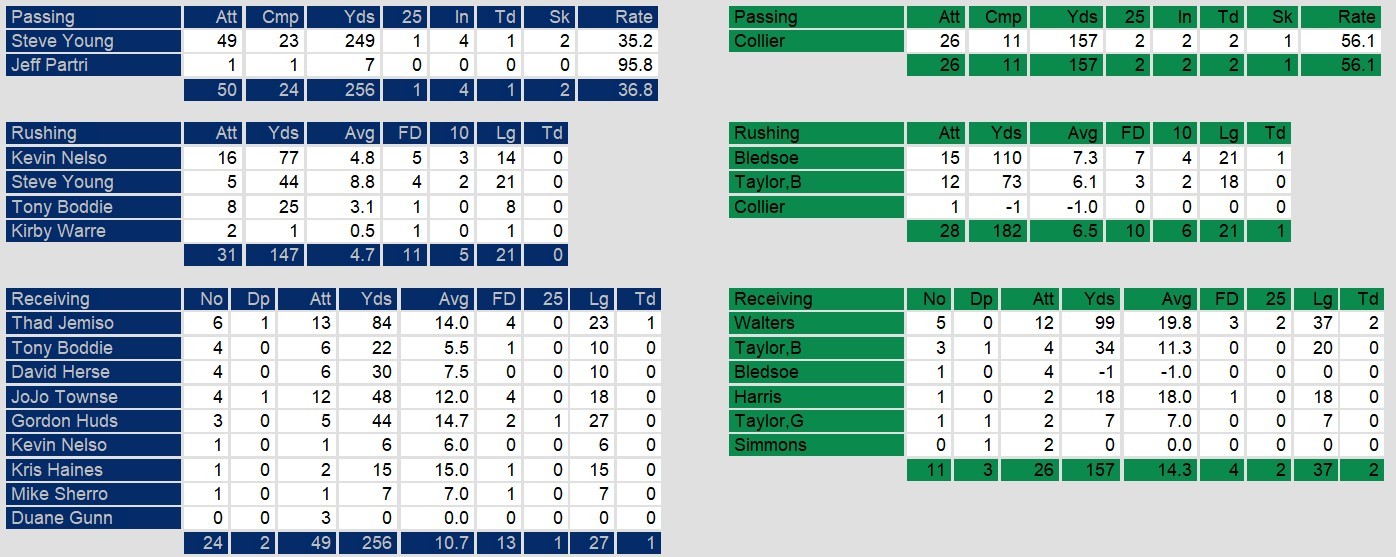 The Express, despite their struggles this season, were determined to spoil the Federals’ postseason ambitions. Led by Steve Young, Los Angeles clawed back from an early deficit, with Young connecting on a clutch 10-yard touchdown pass to Thad Jemison to briefly take a 17-14 lead in the final quarter. However, turnovers plagued the Express, as Washington’s opportunistic defense intercepted Young four times, including a critical pick by Vernon Jackson late in the game to extinguish a potential comeback.