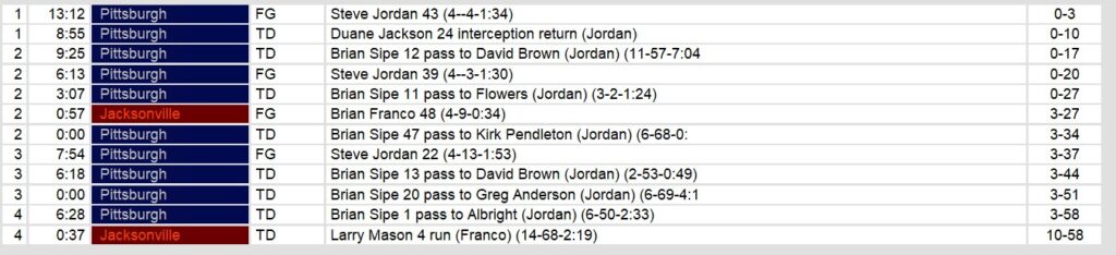 Jacksonville struggled from the outset, with quarterback Buck Belue throwing two interceptions and losing a fumble. The Bulls managed only a late fourth-quarter touchdown, a 4-yard run by Larry Mason, to avoid a single-digit scoreline. Despite the loss, Jacksonville’s playoff hopes remain intact, but they’ll need a significant turnaround to compete in the postseason. Meanwhile, Pittsburgh heads into the playoffs brimming with confidence after their dominant finale.
