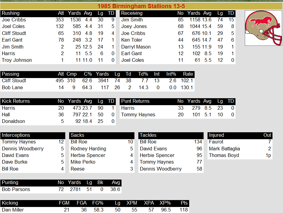 1985 Birmingham Stallions Stats