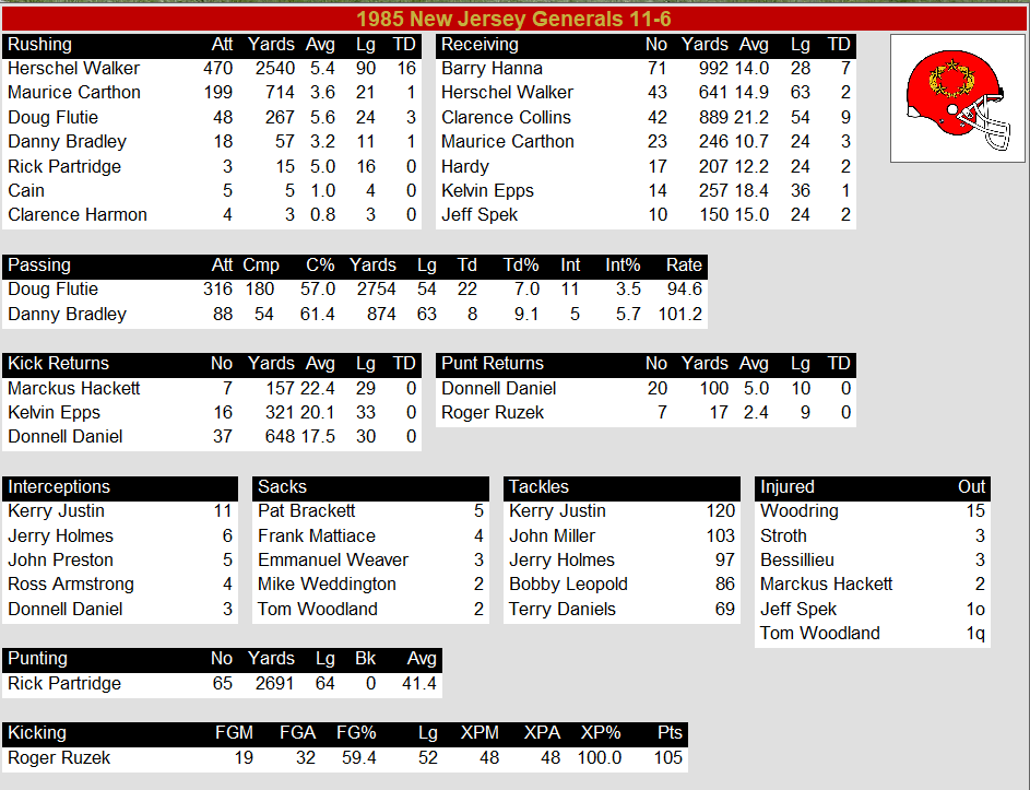 - Doug Flutie brought excitement with his improvisational magic, throwing for 2,754 yards, 22 TDs, and a 94.6 passer rating while adding 267 rushing yards and 3 TDs. His chemistry with WRs Barry Hanna (992 yards, 7 TDs) and Clarence Collins (889 yards, 9 TDs) gave the Generals a legitimate deep threat.