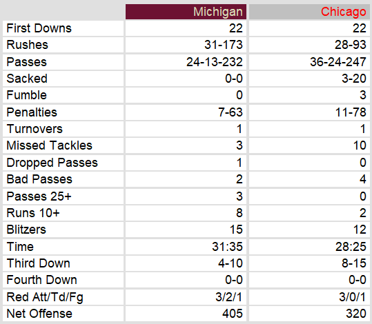 • Ground Control: Michigan outrushed Chicago 173-93, with Bentley accounting for 76% of their rushing yards.