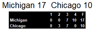 • Injury Watch: Michigan lost defensive tackle Kevin Fagan (3 weeks) to a knee injury, while Chicago emerged physically intact.