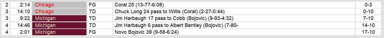 The turning point came early in the fourth quarter when Harbaugh found versatile running back Albert Bentley (131 rushing yards, 60 receiving yards) on a 6-yard touchdown pass to give Michigan its first lead at 14-10. Bentley, named MVP, was the engine of the Panthers’ attack, ripping off six runs of 10+ yards and adding five receptions. Chicago had chances to respond, but two missed field goals and a critical interception by Michigan’s David Davis in the final minutes sealed their fate. Novo Bojovic added a 39-yard field goal with 2:01 remaining to ice the game, while the Panthers’ defense held firm, sacking Long three times and forcing three fumbles (recovering none).