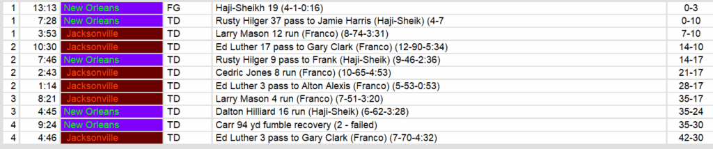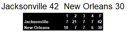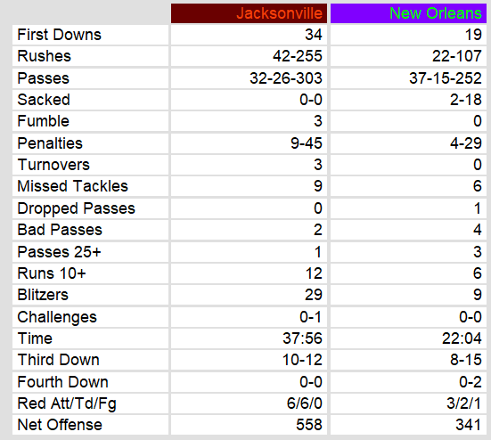 • Red Zone Perfection: Jacksonville went 6-for-6 in the red zone, while New Orleans settled for a field goal on their only trip inside the 20.