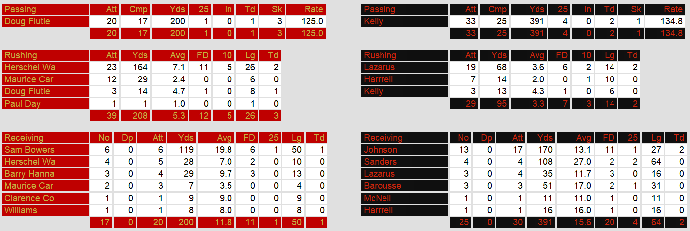 Houston quarterback Jim Kelly (25/33, 391 yards, 2 TD) was brilliant in defeat, connecting with Ricky Johnson for two touchdowns (15 and 16 yards) and finding Richard Sanders for a 64-yard bomb that set up Sam Harrell’s 5-yard scoring run. The Gamblers’ offense amassed 479 total yards but was undone by untimely mistakes, including a blocked field goal and the late fumble. Running back Todd Fowler (68 yards, 2 TD) provided balance with two tough touchdown runs, but Houston’s defense couldn’t contain Walker, who accounted for 192 total yards (164 rushing, 28 receiving) behind New Jersey’s dominant offensive line.