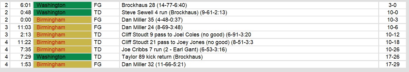 Washington controlled the early momentum, with quarterback Mike Hohensee leading two scoring drives in the second quarter. A 28-yard field goal by Jeff Brockhaus opened the scoring, followed by a 4-yard touchdown run by Steve Sewell to give the Federals a 10-0 lead late in the half. However, Birmingham answered with a Dan Miller field goal as time expired, cutting the deficit to 10-3. The Stallions then took over after halftime, with Miller adding another field goal before Stoudt connected with Joel Coles and Joey Jones for touchdown passes. Cribbs’ 7-yard rushing score late in the fourth quarter sealed the win, though Washington’s Greg Taylor provided a brief spark with an 89-yard kick return touchdown.