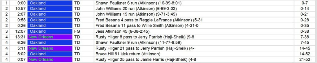 New Orleans’ offense struggled to find rhythm until garbage time, with Rusty Hilger throwing three late touchdowns after the game was already out of reach. The Brass’ offensive line was overwhelmed by Oakland’s aggressive front, allowing four sacks and failing to establish any rushing attack (just 45 yards on 12 carries). Oakland’s defense was particularly stout in critical situations, forcing two turnovers and holding New Orleans to just 3-of-11 on third down conversions. The Invaders’ special teams also contributed with Bruce Hill’s 91-yard kickoff return touchdown in the fourth quarter that snuffed out any hope of a Brass comeback.