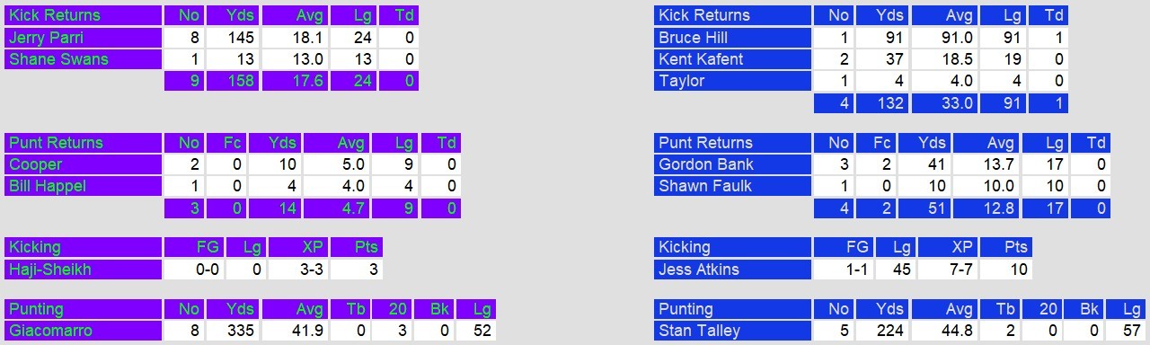 New Orleans’ offense struggled to find rhythm until garbage time, with Rusty Hilger throwing three late touchdowns after the game was already out of reach. The Brass’ offensive line was overwhelmed by Oakland’s aggressive front, allowing four sacks and failing to establish any rushing attack (just 45 yards on 12 carries). Oakland’s defense was particularly stout in critical situations, forcing two turnovers and holding New Orleans to just 3-of-11 on third down conversions. The Invaders’ special teams also contributed with Bruce Hill’s 91-yard kickoff return touchdown in the fourth quarter that snuffed out any hope of a Brass comeback.