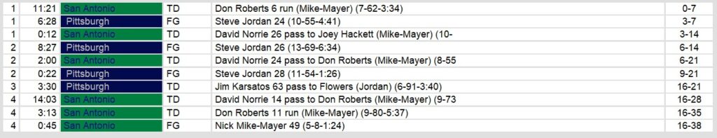 Pittsburgh (0-3) showed flashes of offensive life, with quarterback Jim Karsatos connecting with Greg Flowers for a 63-yard touchdown strike in the third quarter to cut the deficit to 21-16. However, three costly interceptions – including two in the fourth quarter – doomed any comeback hopes. Running back Mike Rozier managed 91 rushing yards but lost two fumbles, as the Maulers’ red zone struggles continued with three Steve Jordan field goals being their only rewards from six trips inside the 20-yard line. San Antonio’s defense, led by Steve Jarecki’s 10 tackles and three different players recording interceptions, consistently made big plays when needed.
