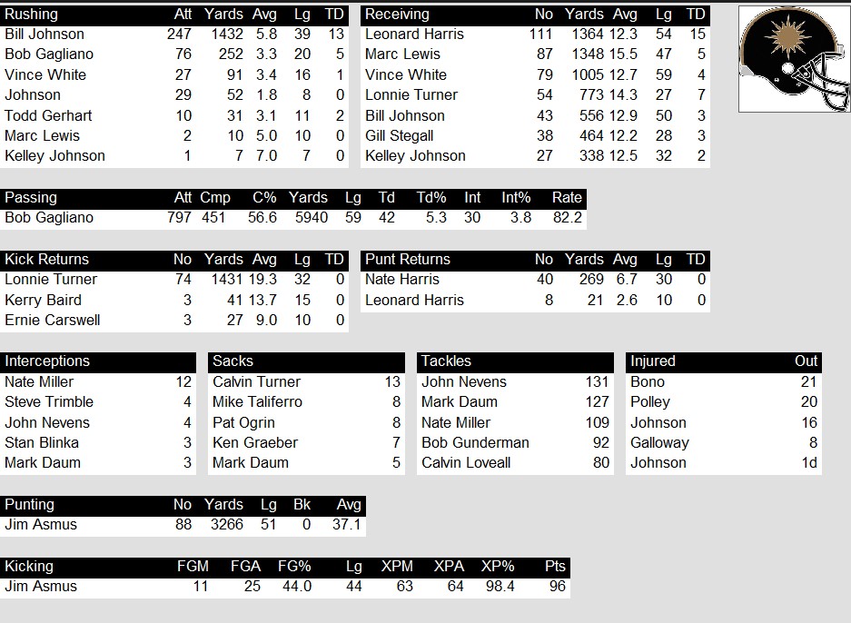 The 1985 Denver Gold season was a rollercoaster, but it ended with a thrilling playoff run that few saw coming. After stumbling to a dismal 4-8-1 record through Week 13, the Gold caught fire, winning their final five regular-season games to sneak into the playoffs at 9-8-1. Quarterback Bob Gagliano was the catalyst, throwing for 5,940 yards and 42 touchdowns while spreading the ball to a deep receiving corps led by Leonard Harris (1,364 yards, 15 TDs) and Marc Lewis (1,348 yards). The ground game also thrived, with Bill Johns rushing for 1,432 yards and 13 scores. The defense, anchored by linebacker Mike Nevens (131 tackles, 4 INTs) and defensive end Dennis Turner (13 sacks, 26 hurries), found its rhythm just in time for a postseason push.
