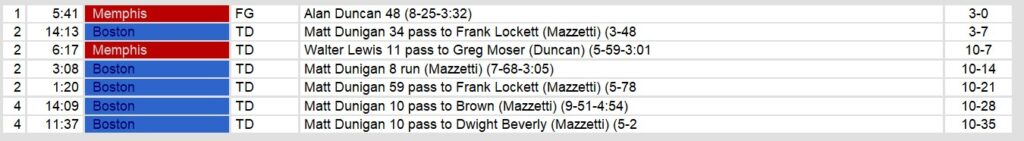Matt Dunigan delivered a masterful performance to lead the Boston Breakers to a convincing 35-10 victory over the winless Memphis Showboats at Nickerson Field. The Boston quarterback accounted for four total touchdowns, throwing for 308 yards and three scores while adding 53 rushing yards and another touchdown on the ground. Dunigan’s favorite target Frank Lockett torched Memphis’ secondary with two explosive touchdowns – including a 59-yard bomb in the second quarter – as part of his 99-yard receiving day. The Breakers’ offense overcame four interceptions by converting 7-of-14 third downs and scoring touchdowns on three of five red zone trips, while their defense harassed Memphis quarterback Walter Lewis into a miserable 10-for-30 passing performance with four sacks.