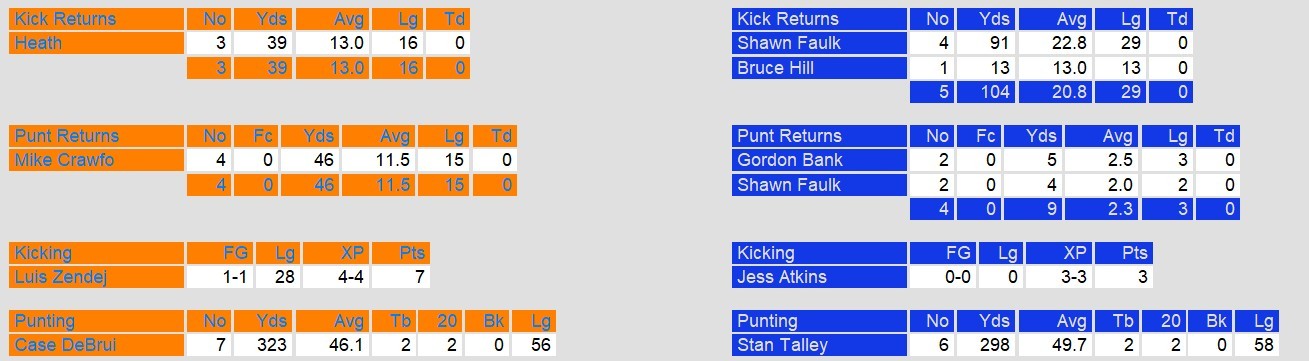 Oakland’s offense finally awoke in the final 17 minutes, with Besana throwing three touchdown passes to make the score respectable after the game had been decided. The Invaders’ typically potent ground game was held to just 65 yards, with John Williams limited to 56 yards on 18 carries. Arizona’s defensive front dominated throughout, sacking Besana twice and consistently disrupting Oakland’s rhythm, while the secondary made life miserable for the veteran quarterback with tight coverage and timely takeaways. The Wranglers’ special teams also contributed, with Mike Crawford averaging 11.5 yards on punt returns and Luis Zendejas converting all four extra points plus a 28-yard field goal.