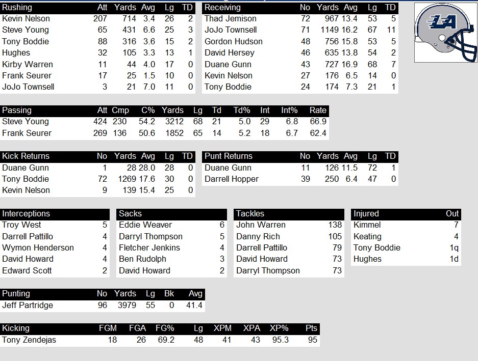Quarterback Steve Young put up respectable yardage totals (3,212 yards passing and 431 rushing), but faced relentless pressure behind a deteriorating offensive line. He was sacked 63 times and turned the ball over far too often—throwing 23 interceptions and fumbling 10 times. Backup Frank Seurer saw significant time as well but didn’t fare much better, contributing 12 more interceptions. Despite the quarterback woes, the receiving corps was a bright spot. JoJo Townsell and Thad Jemison both crossed the 900-yard mark, with Townsell catching 11 touchdowns and showing elite explosiveness.