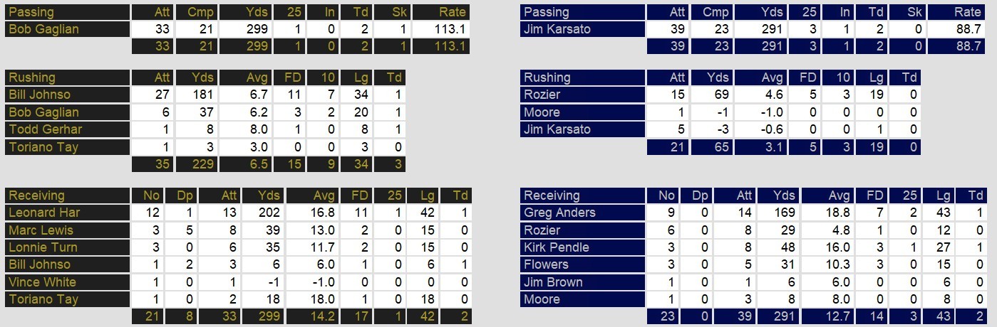 Denver’s dominance continued after halftime as they marched 89 and 91 yards on back-to-back third-quarter possessions, capped by short touchdown runs from Bill Johnson and Todd Gerhart. Gagliano added his third total touchdown early in the fourth quarter with a 6-yard toss to Johnson, who also rushed for 181 yards on the day. Gagliano finished with 299 yards through the air, while Harris torched the Maulers for 202 receiving yards on 12 catches. Denver’s offense racked up 518 total yards, converting six of eight third downs and holding the ball for over 32 minutes.