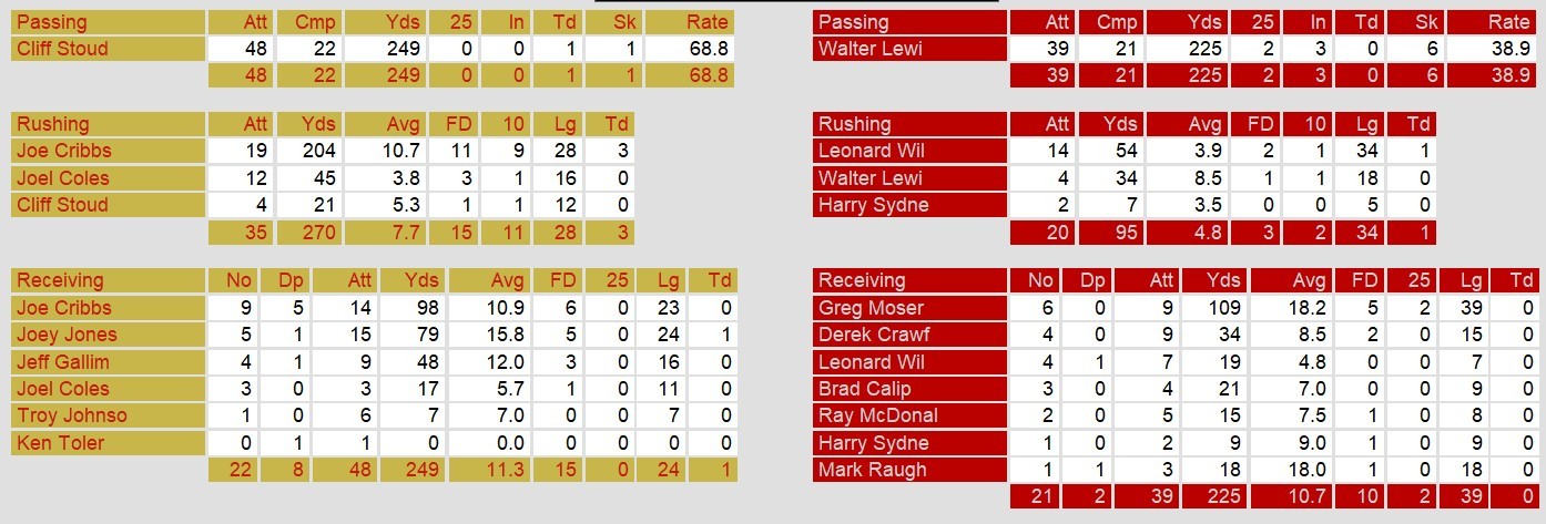 Quarterback Cliff Stoudt managed the offense effectively, completing 22 of 48 passes for 249 yards and a touchdown to Joey Jones, but it was the Stallions’ ground game and swarming defense that stole the show. Birmingham racked up 514 yards of total offense and held the ball for nearly 36 minutes, wearing down a Memphis defense that struggled with missed tackles and couldn’t find answers for Cribbs. Meanwhile, the Stallions’ pass rush harassed Memphis quarterback Walter Lewis all game, sacking him six times and intercepting three passes—including picks by Tommy Haynes, David Evans, and Dennis Wood.
