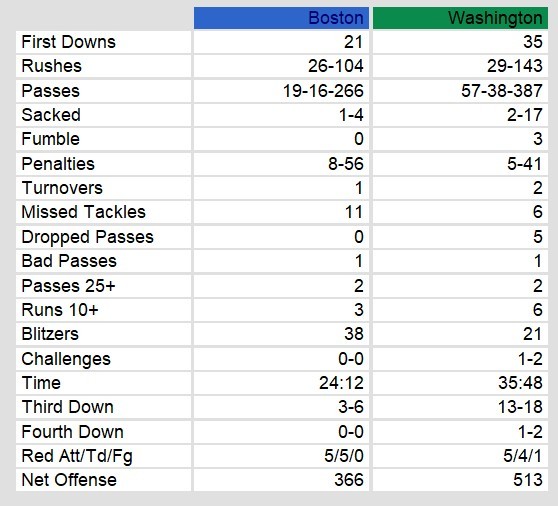 Washington, despite trailing by as many as 18 points, showed resilience behind the arm of quarterback Mike Honensee. He threw for 387 yards and four touchdowns, including two to wide receiver Harris, who notched a career-best 170 receiving yards on 13 catches. Running back Steve Sewell chipped in with 112 yards on the ground, a rushing touchdown, and another score through the air. The Federals won the time of possession battle by more than 11 minutes and converted an impressive 13 of 18 third downs, but two costly turnovers and a key missed two-point conversion proved to be the difference.