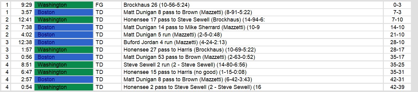 On a brisk Sunday afternoon at RFK Memorial Stadium, the Boston Breakers staved off a furious Washington comeback to escape with a 42–39 victory and improve to 3–0 on the season. Boston quarterback Matt Dunigan was brilliant, tossing four touchdown passes and running for another en route to MVP honors. Dunigan’s favorite target was wideout Brown, who hauled in five catches for 105 yards and three scores, including a back-breaking 53-yard strike late in the third quarter.