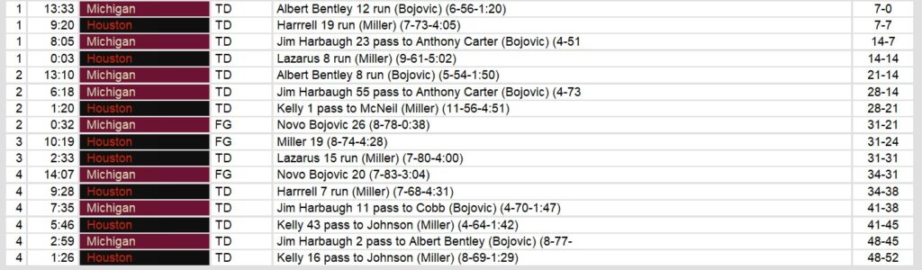 Michigan struck first and struck often, jumping out to a 31–21 halftime lead behind the dynamic trio of Jim Harbaugh, Anthony Carter, and Albert Bentley. Harbaugh threw for 440 yards and four touchdowns, with Carter racking up 200 yards and two scores on just five catches. Bentley added two rushing touchdowns and a receiving score, seemingly answering every Houston surge with a counterpunch of his own. But the Panthers’ defense, worn down by Houston’s relentless ground game, struggled to get stops when it mattered most.