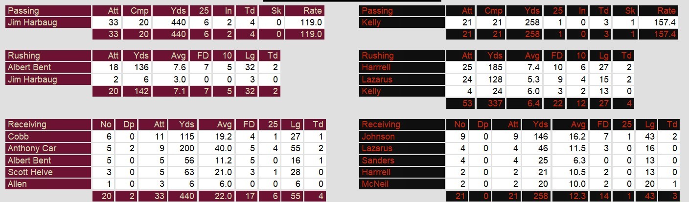 Michigan struck first and struck often, jumping out to a 31–21 halftime lead behind the dynamic trio of Jim Harbaugh, Anthony Carter, and Albert Bentley. Harbaugh threw for 440 yards and four touchdowns, with Carter racking up 200 yards and two scores on just five catches. Bentley added two rushing touchdowns and a receiving score, seemingly answering every Houston surge with a counterpunch of his own. But the Panthers’ defense, worn down by Houston’s relentless ground game, struggled to get stops when it mattered most.