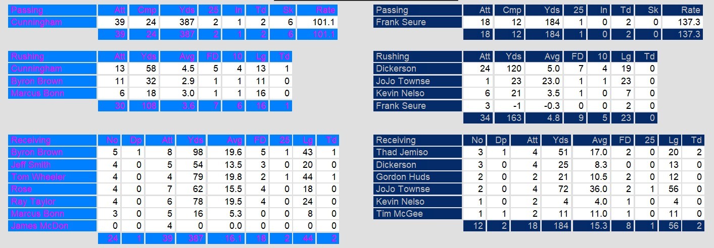 Cunningham shined again for the winless Ace. With almost no help from his running backs again, he went 24-39 with 287 yards and 2 touchdowns. He also led the team in rushing on 13 for 58 with another touchdown. He was responsible for the team’s only touchdowns on the day. If the Ace gets him some rushing help, they might just be a dangerous team going forward.
