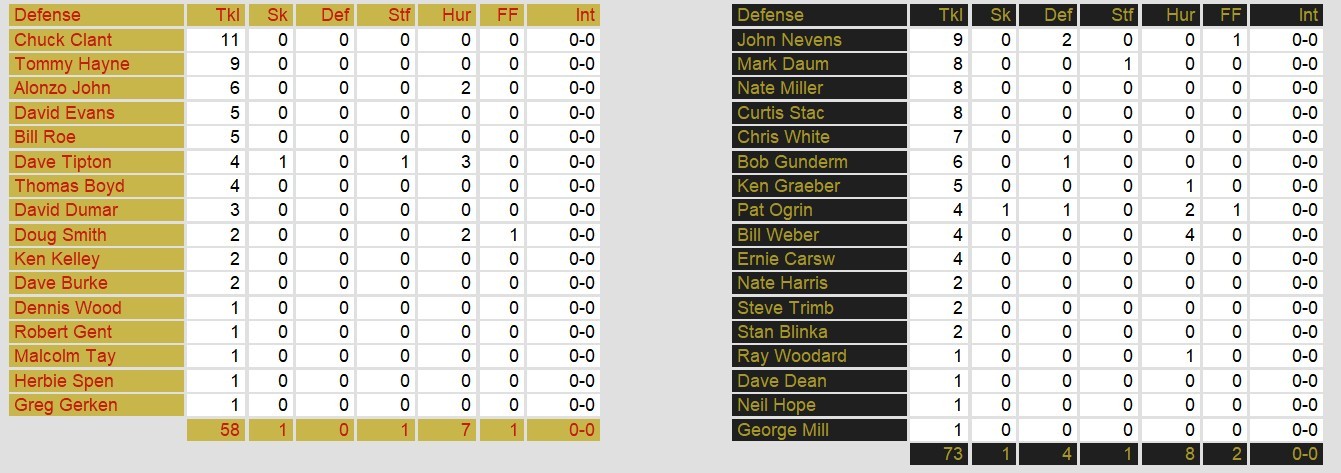 Birmingham then had the chance to win it in overtime but Miller missed a 45 yard field goal. That led to the winning drive and field goal by Denver. Both offenses had a field day, gaining over 600 yards each. Birmingham showed slightly more balance with 200 yards rushing. Meanwhile, Bob Gagliano threw for over 500 yards for Denver.