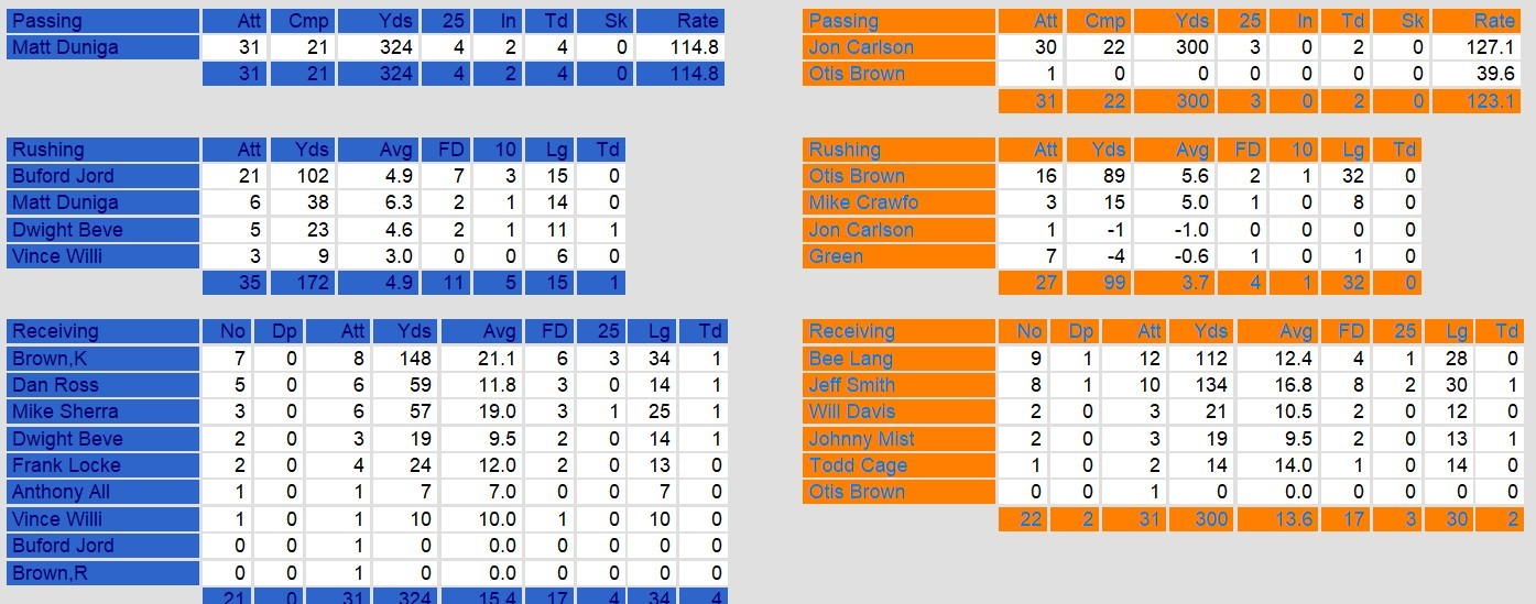John Carlson showed some promise for the future for Arizona, throwing for 2 touchdowns himself. But the Boston offense proved too much in the desert. They gained almost 500 yards on the day. With Dunigan throwing the ball and Jordan running for over 100 yards, Boston will bedifficult to beat.
