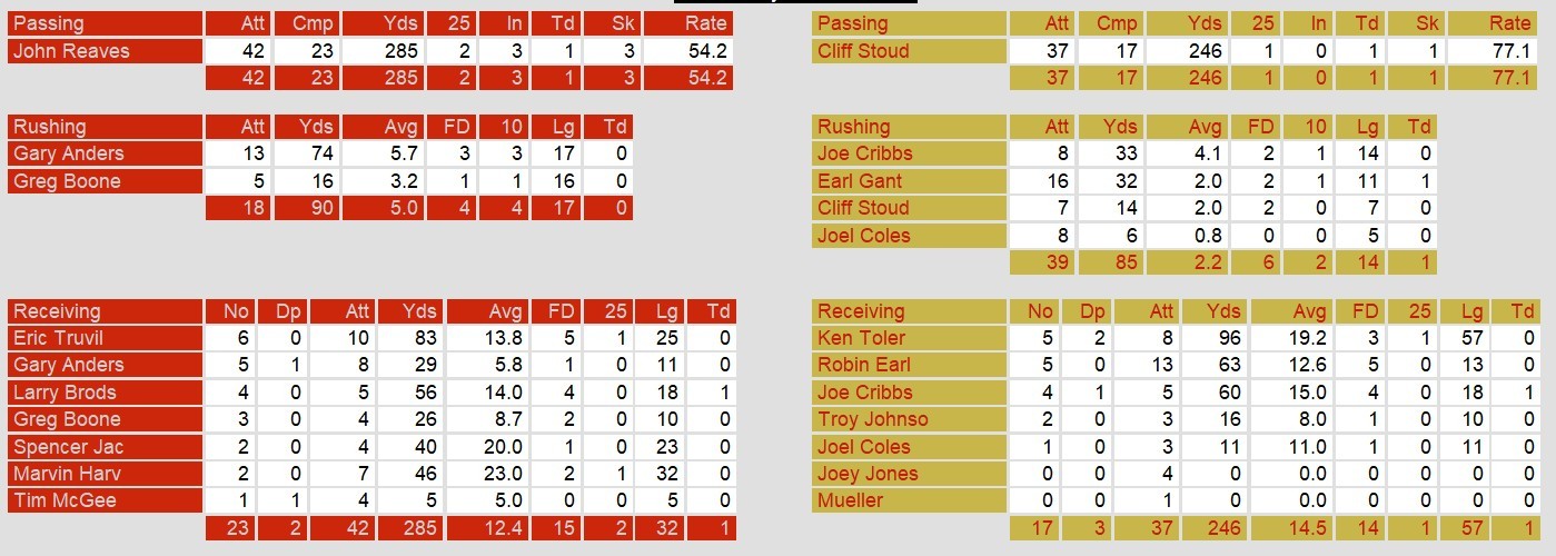With the two headed running game of Birmingham kept in check for the game, quarterback Cliff Stoudt helped to keep the offense going just enough to pull off the win. The Stallions defense ruled the day, adding two other interceptions, 3 sacks, and 3 forced fumbles to dominate Tampa’s offense.