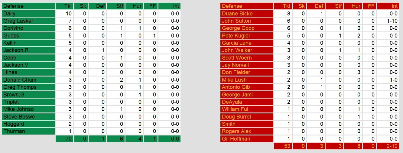 Washington broke through to the end zone first with a Bledsoe plunge. The lead held until Fusina finally found the end zone with about a minute and a half left in the game. Philadelphia dominated in all stats except for the scoreboard. But, as they say, a win is a win.