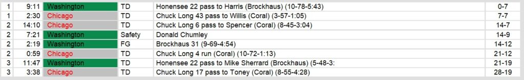 Dateline: Sunday, March 24, 1986. Chicago took care of business on the road against Washington in a battle between two teams who are trying to find some wins. Chicago quarterback Chuck Long provided all of the scoring with four touchdown passes. The game showed the promise that Chicago saw in Long when they took him to lead their team.