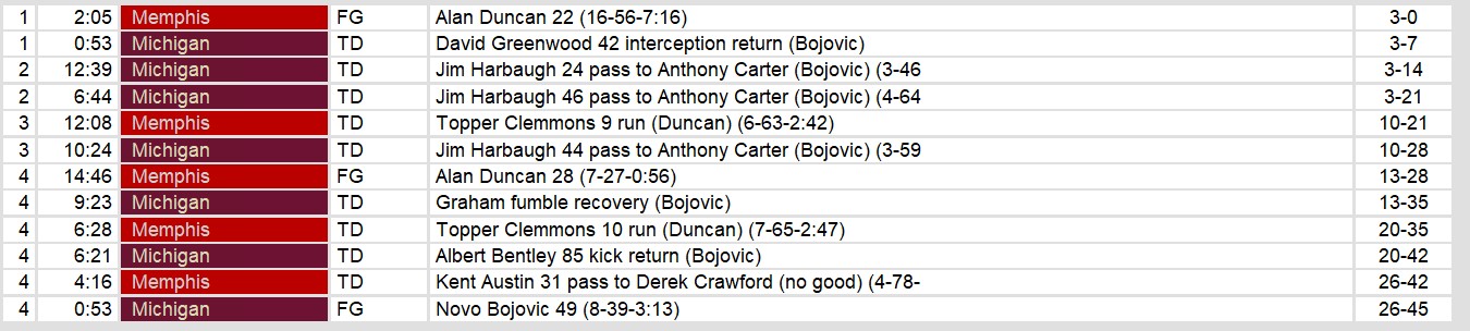 Dateline: Sunday, March 24, 1986. Michigan took care of business in the dome, handily defeating Memphis. Michigan’s young quarterback Jim Harbaugh threw three interceptions, but he made up for it with three touchdown passes to Anthony Carter.