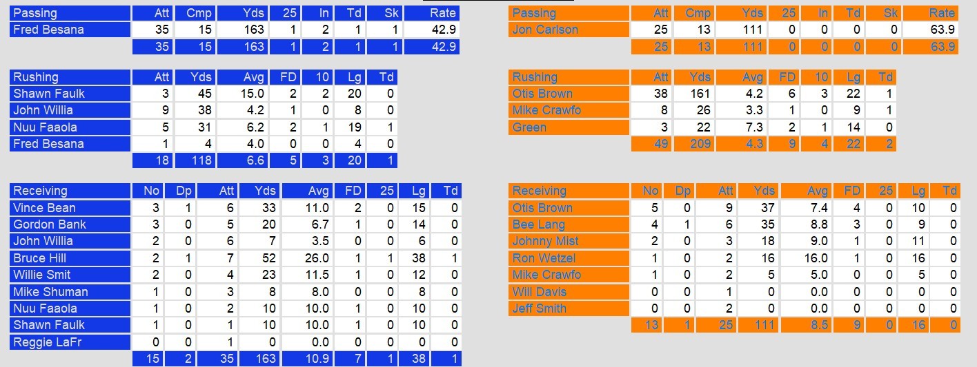 Dateline: Friday, March 28, 1986. Arizona pulled off a minor upset over divisional rival Oakland on Friday evening in the desert. In spite of a mediocre performance by starting quarterback Jon Carlson, the run game more than made up for it. 209 yards rushing, including 161 from Otis Brown and two touchdowns on the game.