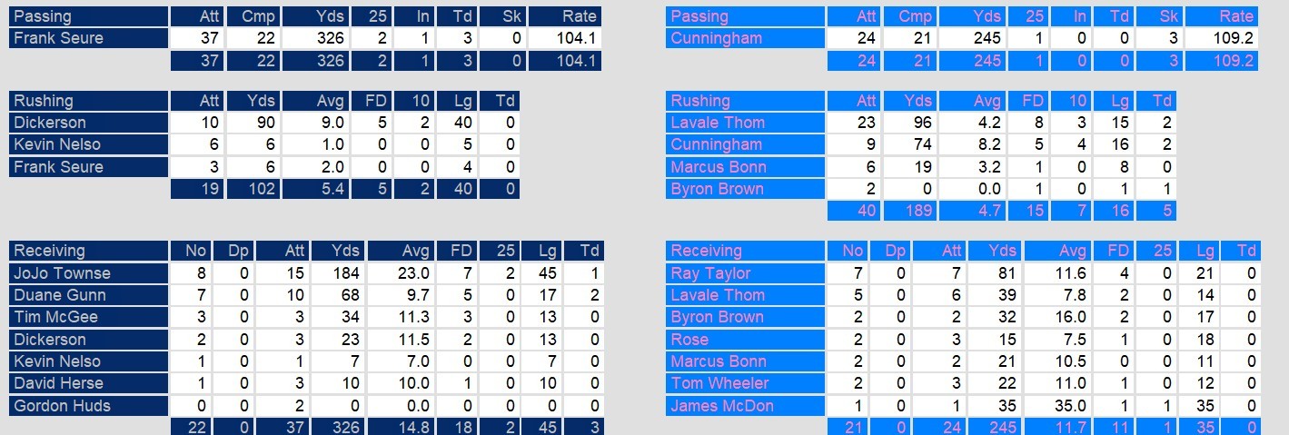 Dateline: Sunday, April 6, 1986. Las Vegas shocked Los Angeles in the desert late Sunday with a powerful running game. While Cunningham was again precise, he threw no touchdowns in the game. However, combined with Lavale Thomas, they ran for 170 yards and 4 touchdowns combined.