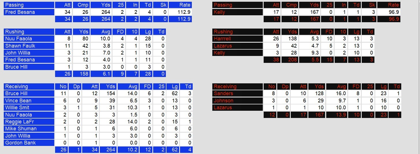 For Oakland, quarterback Fred Besana threw 4 touchdowns. However, he also threw 2 costly interceptions, sealing Oakland’s fate and their loss. Their new running back Nu’u Fa’aola ran for 80 yards in the game on only 8 attempts.