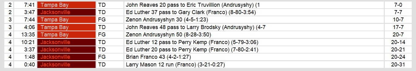 Ed Luther then threw two consecutive touchdown passes to Perry Kemp. Larry Mason added another late in the game to cement the victory. Tampa Bay struggled with interceptions late, also sealing their fate against the 6-2 Bulls.