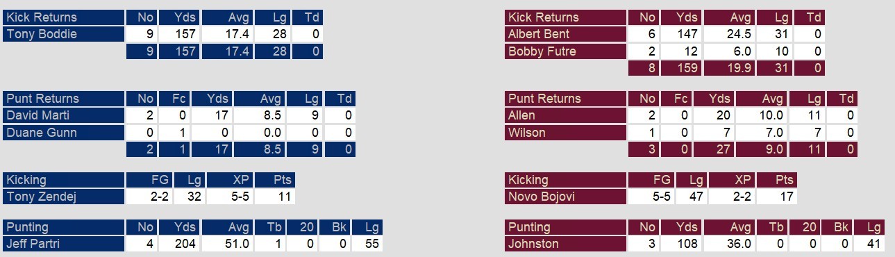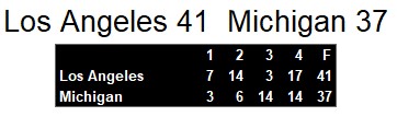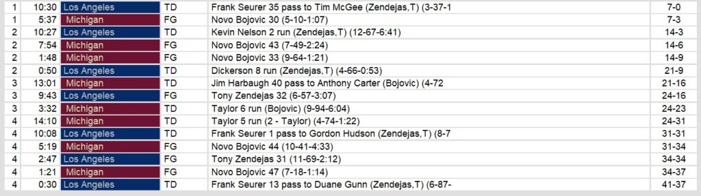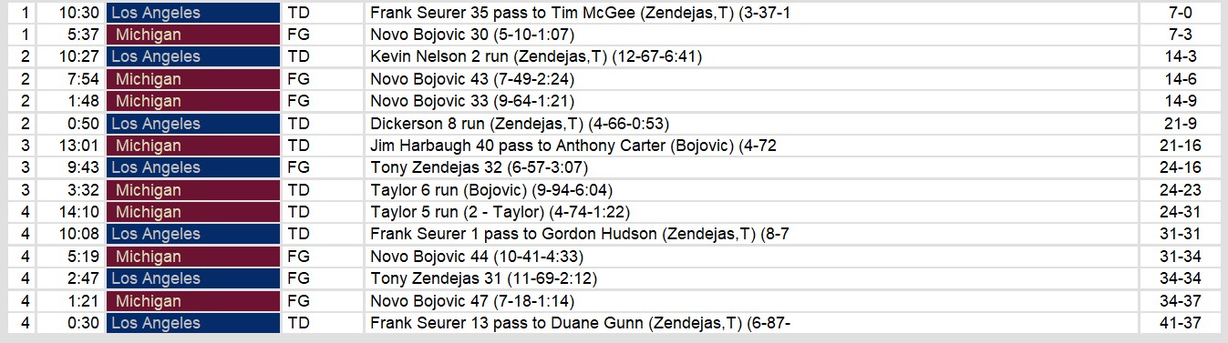 An interception on the final drive Hail Mary by Michigan sealed the game for Los Angeles. In the loss, young quarterback Jim Harbaugh threw only one touchown. The run game added two more. Novo Bojovic kicked 6 field goals, including the one that gave Michigan the lead late.