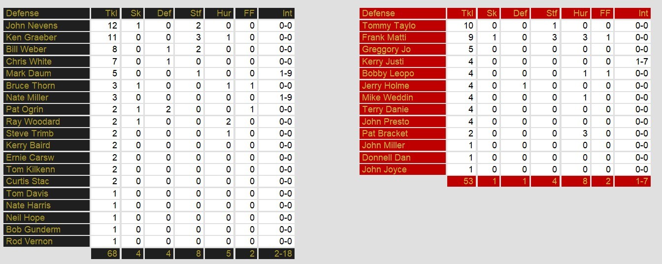 The normally robust Denver passing offense sputtered for only 149 yards and no toucdhowns. Flutie, sacked 4 times on the day, managed only 195 passing yards and the touchdown at the end of the first half that gave New Jersey the win ultimately.