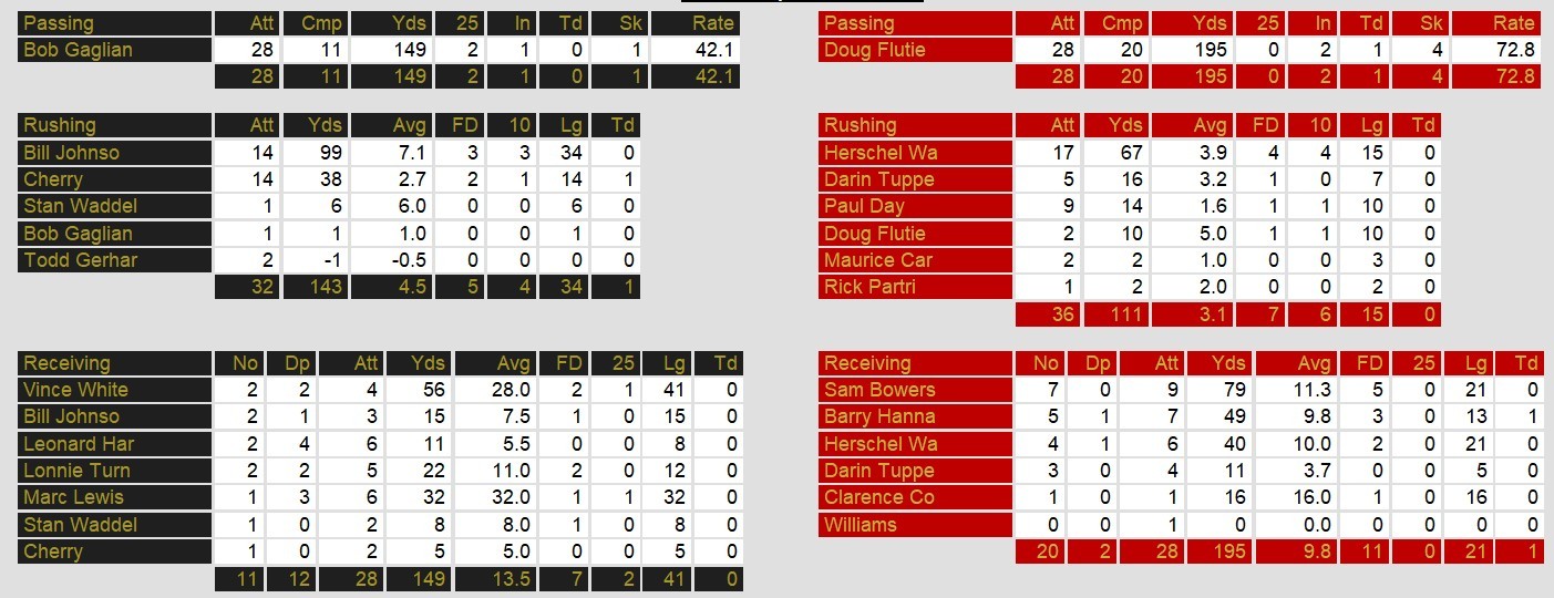 The normally robust Denver passing offense sputtered for only 149 yards and no toucdhowns. Flutie, sacked 4 times on the day, managed only 195 passing yards and the touchdown at the end of the first half that gave New Jersey the win ultimately.