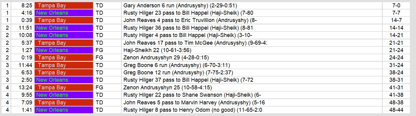 Dateline: Sunday, April 20, 1986. Tampa Bay won a wild one over home New Orleans in the dome on Sunday. The Brass run game managed only 18 net yards on the game. Quarterack Rusty Hilger played some hero ball and threw for just under 500 yards and 6 touchdowns.