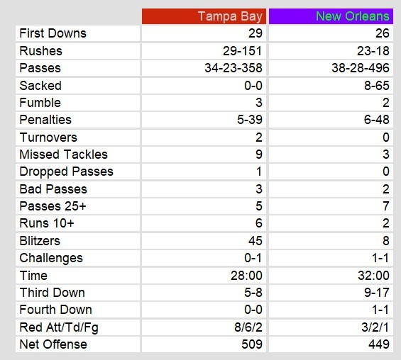But, the Tampa run and pass game ground down New Orleans with a more balanced 3 touchdowns each. Hilger suffered some at the Tampa defense, too, enduring 8 sacks on the game. With the win, Tampa moves to 4-5 and within striking distance of the playoffs.