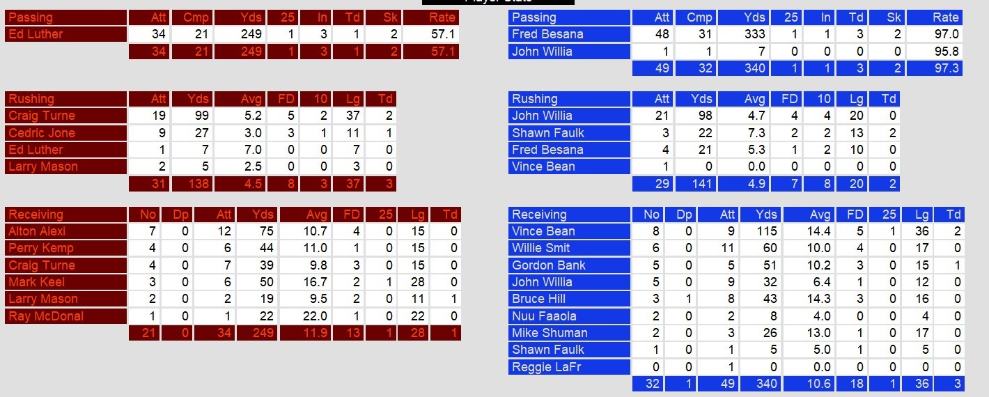 Meanwhile, Jacksonville falls to 7-3 and still in the hunt for the South division title. Their running game put up 3 touchdowns on the Oakland defense, but that same defense hassled quarterback Ed Luther into 3 costly interceptions in the game,
