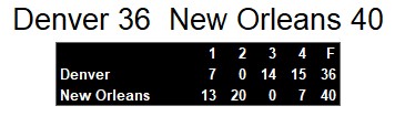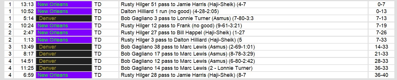 Dateline: Sunday, April 27, 1986. New Orleans outlasted Denver in a shootout on Sunday afternoon at home. After building a 33-14 lead, Denver came back to score 22 straight. Rusty Hilger then threw one of his 5 touchdown passes about halfway through the fourth quarter. An interception on the next drive all but sealed the win until a missed field goal gave Denver one last chance.